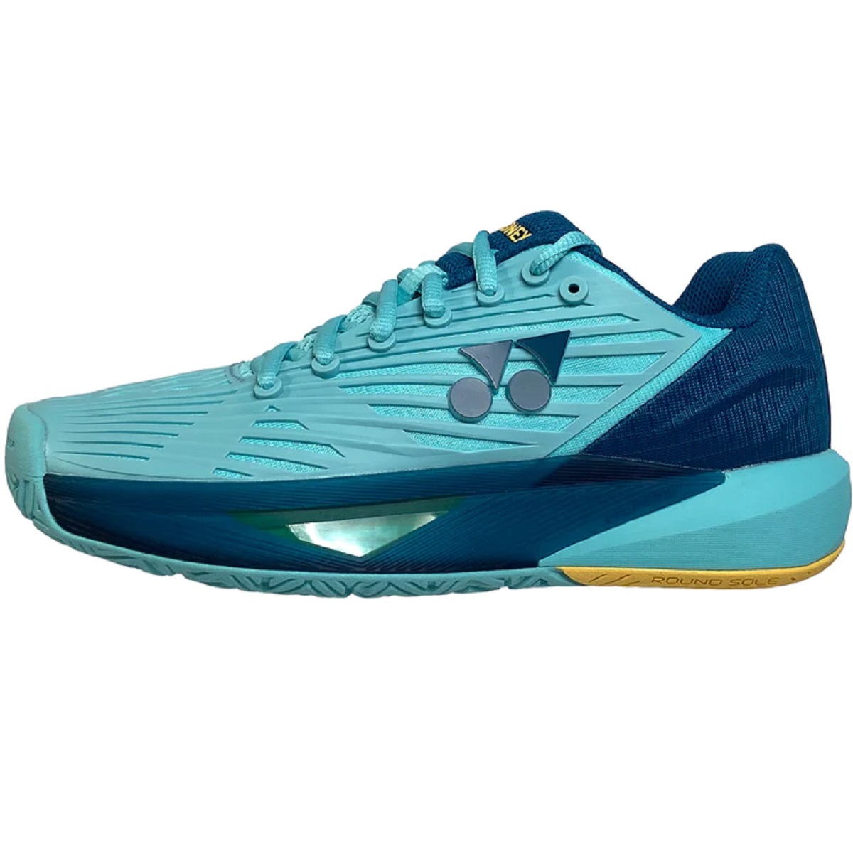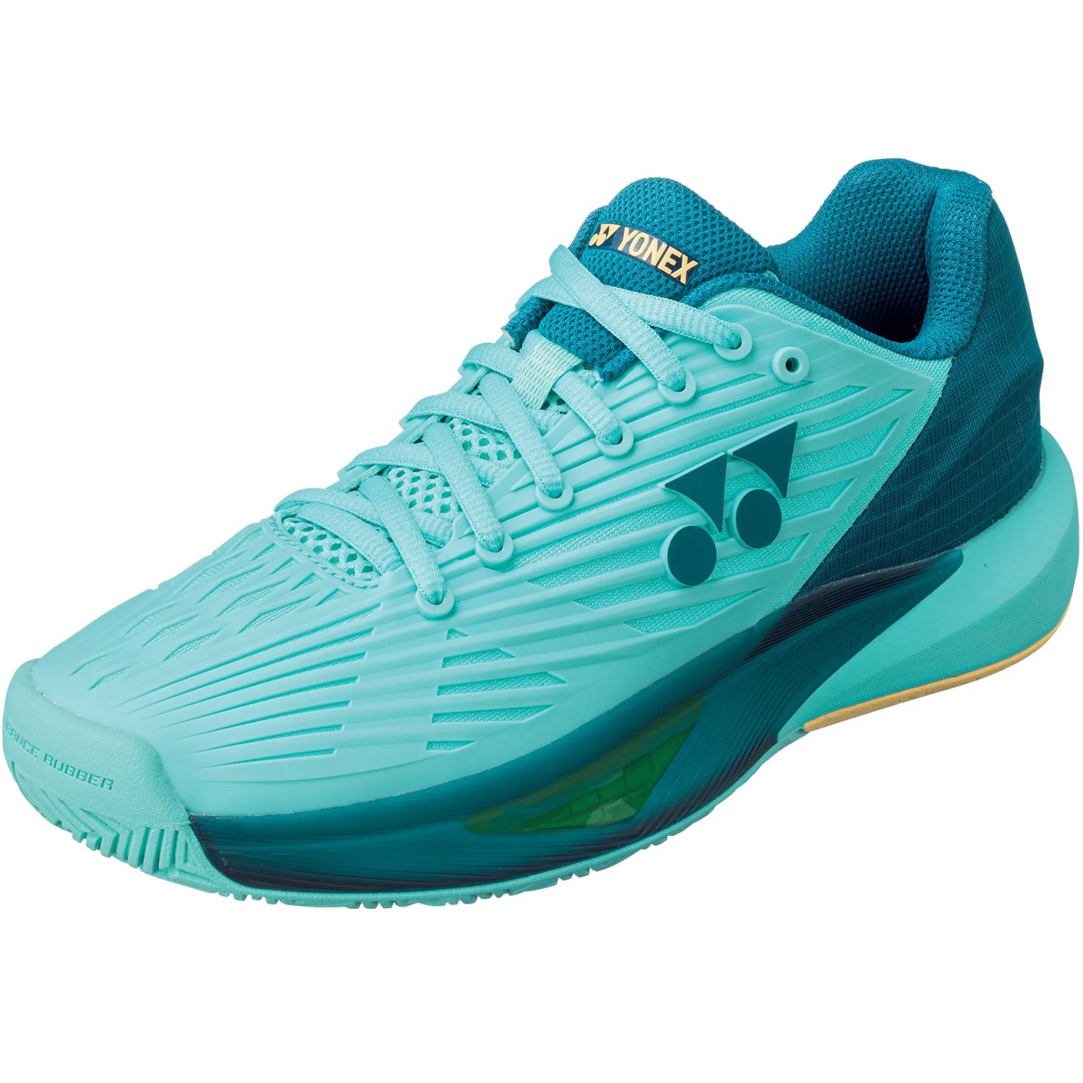 The Yonex Women's Power Cushion Eclipsion 5 Tennis Shoes (Cyan) is part of the ECLIPSION 5 series of new tennis shoes for intermediate and advanced players. This footwear was developed to provide superior support for a player’s intense and dynamic footwork during play, including sudden stops and changes in direction that are core to playing tennis. With enhanced stability and fit, the ECLIPSION 5 tennis shoes are designed to help players feel more confident on the court. This All-Court version has the signature shock-absorbing material from Yonex that has been transformed into a new shape that improves shock absorption by 28%, providing extra support on the outer side of the foot. Additionally, POWER CUSHION+ has been integrated with thermoplastic polyurethane (TPU; a resilient material that exhibits both elasticity and plastic-like durability) in the outsole area, which provides increased court gripping and quickens spring back power by 5%. This enables players to quickly change their directions and finetune their movements on the tennis court for better control over their next movement.