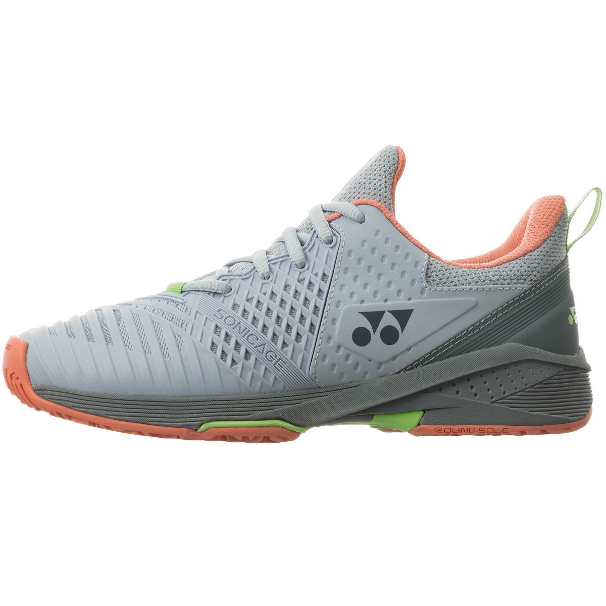 The Yonex Women’s Power Cushion Sonicage 3 Tennis Shoes (Grayish Blue/Pink) is engineered for recreational and intermediate players seeking a lightweight, comfort shoe that supports all movements on the court. The Sonicage 3 is designed to provide all-around support for quick and smooth footwork.